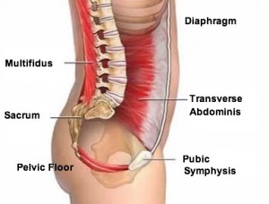 You can practice activating these deep core stabilisers by placing your finger tips just medial of your hips and gently flatten out across your waist. You are looking to feel a slow rising underneath your finger tips. At first it is easiest to use an exhale to achieve this action however after some practice you should be able to maintain the contraction whilst breathing in and out and later on (ideally) progressing to the whole class and work day.